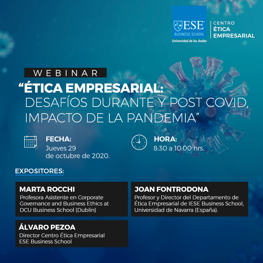 Check out this synthesis of the webinar “BusinessEthics: impact of the covid pandemic” organised by ESE Business School (Universidad de los Andes, Chile) – October 29, 2020. Thank you Álvaro Pezoa and Joan Fontrodona, and thanks to all the participants from Chile!