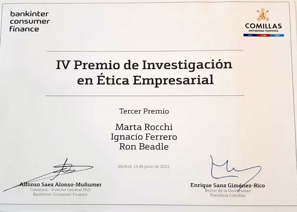 | 2021 | Business Ethics Research Prize (3rd prize) | Bankinter Consumer Finance and the Business Ethics Chair at ICADE Business School |