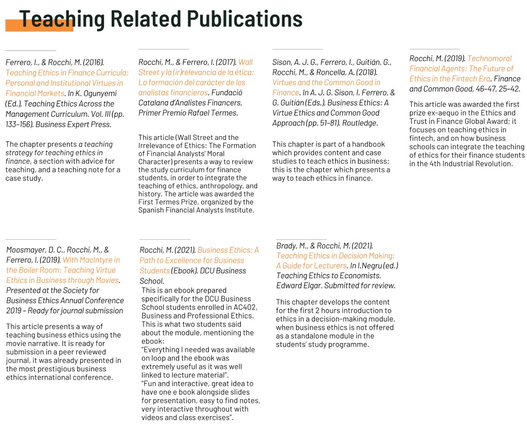 I really care about my development as a lecturer: I keep up-to-date with the most recent literature in the business ethics field, regarding ways of teaching business ethics. Business ethics academics usually write about the way they teach their subject. I tried to have a publication every year on a teaching topic, starting from 2016 (please see the list in the image below). Moreover, I am constantly in touch with a wide community of scholars thanks to the membership with the Society for Business Ethics, and with the Virtue Ethics in Business Research Group. I received a scholarship in 2019 to participate in the Global Business Ethics Teaching Workshop organised by Bentley University (Boston, MA), where I shared my experience of teaching business ethics in DCU and I attended four intense days of sessions with top business ethics scholars who shared their teaching strategies; I looked for feedback on the module I teach also at the 2019 DCU Teaching and Learning Day. During the pandemic, I attended the Harvard Business Publishing webinar on “Making Online Classrooms Work for You (and Your Students)”, and I followed our TEU updates, tips, suggestions, and implemented some of them in my module (e.g. use of Vevox for students’ engagement).